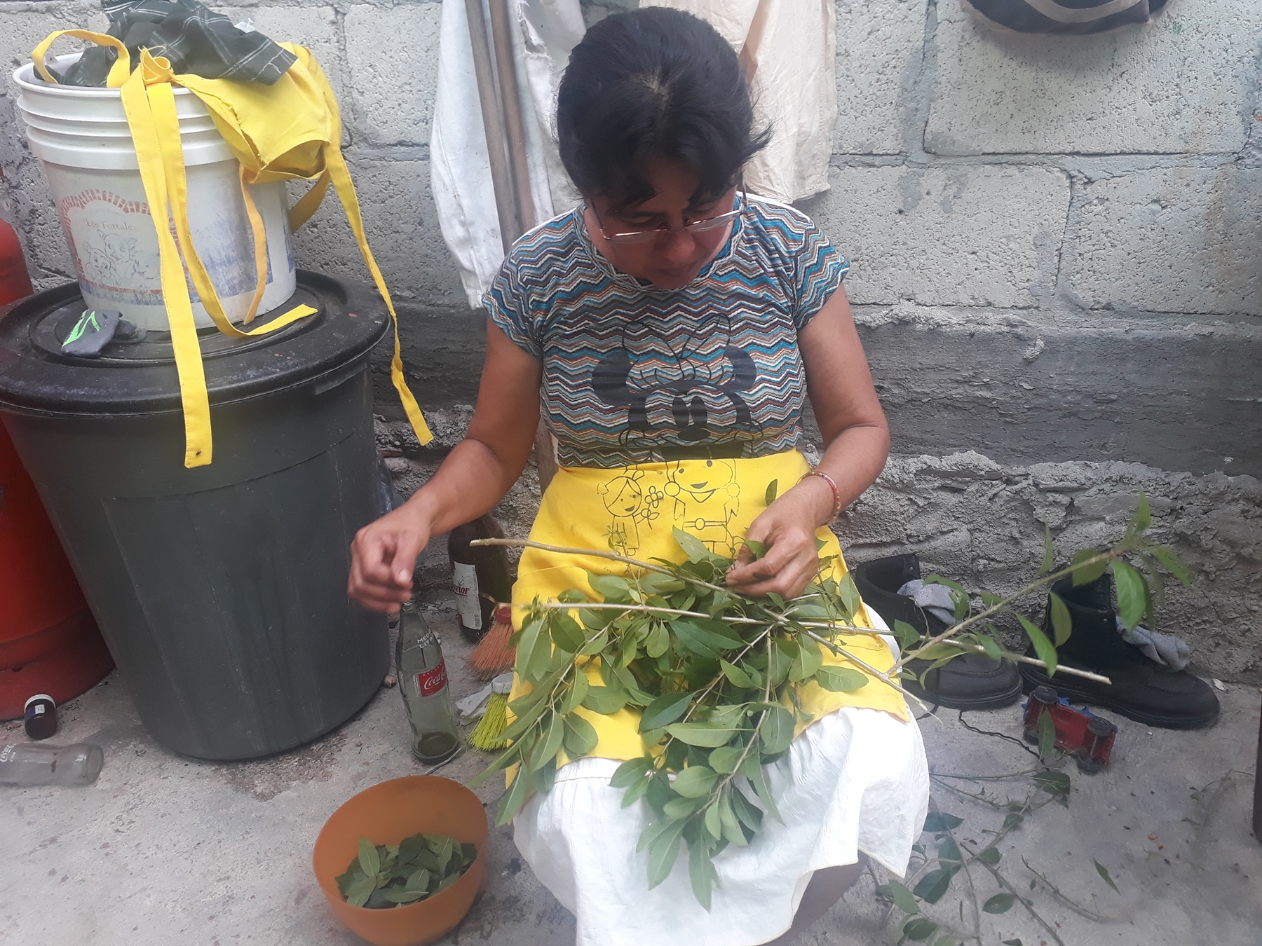 Con una fuerza imprescindible combinada con la delicadeza de sus manos, muele cada una de las hojas para formar una pasta verdosa, calculando cada porción para no pasarse de la medida, que ya es apunta de pulso.
