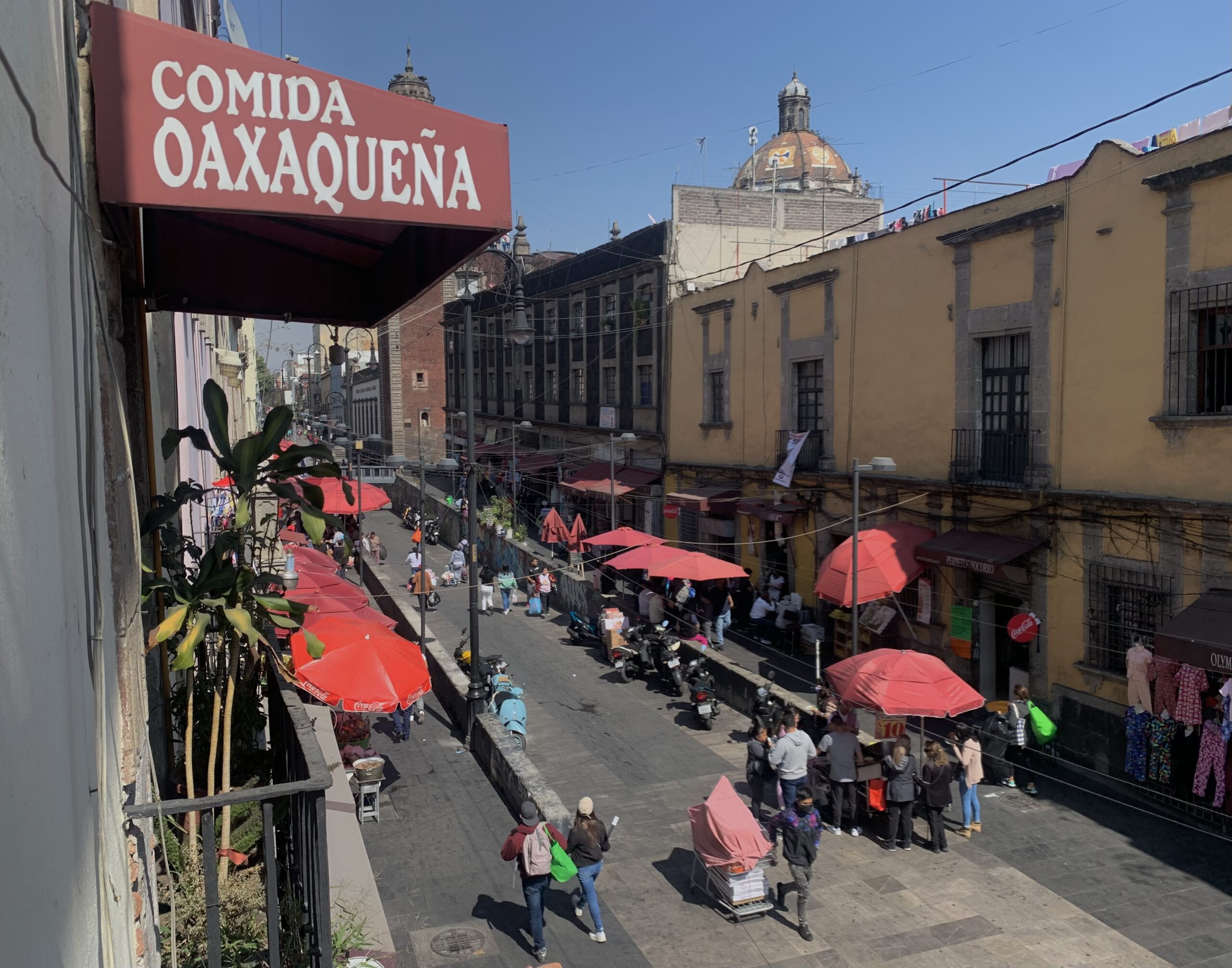 Desde la terraza observas la vendimia callejera del centro de la Ciudad de México: calcetines, cachuchas de beis, lápices cosméticos, pashminas y todo lo que se te ocurra. Y ahí abajo también pasan los fieles de la vecina Iglesia de la Santísima Trinidad, fundada como ermita en 1567 por las monjas de Santa Clara, templo hermoso y sobre poblado aunque se cae a cachos como si lo hubieran bombardeado.