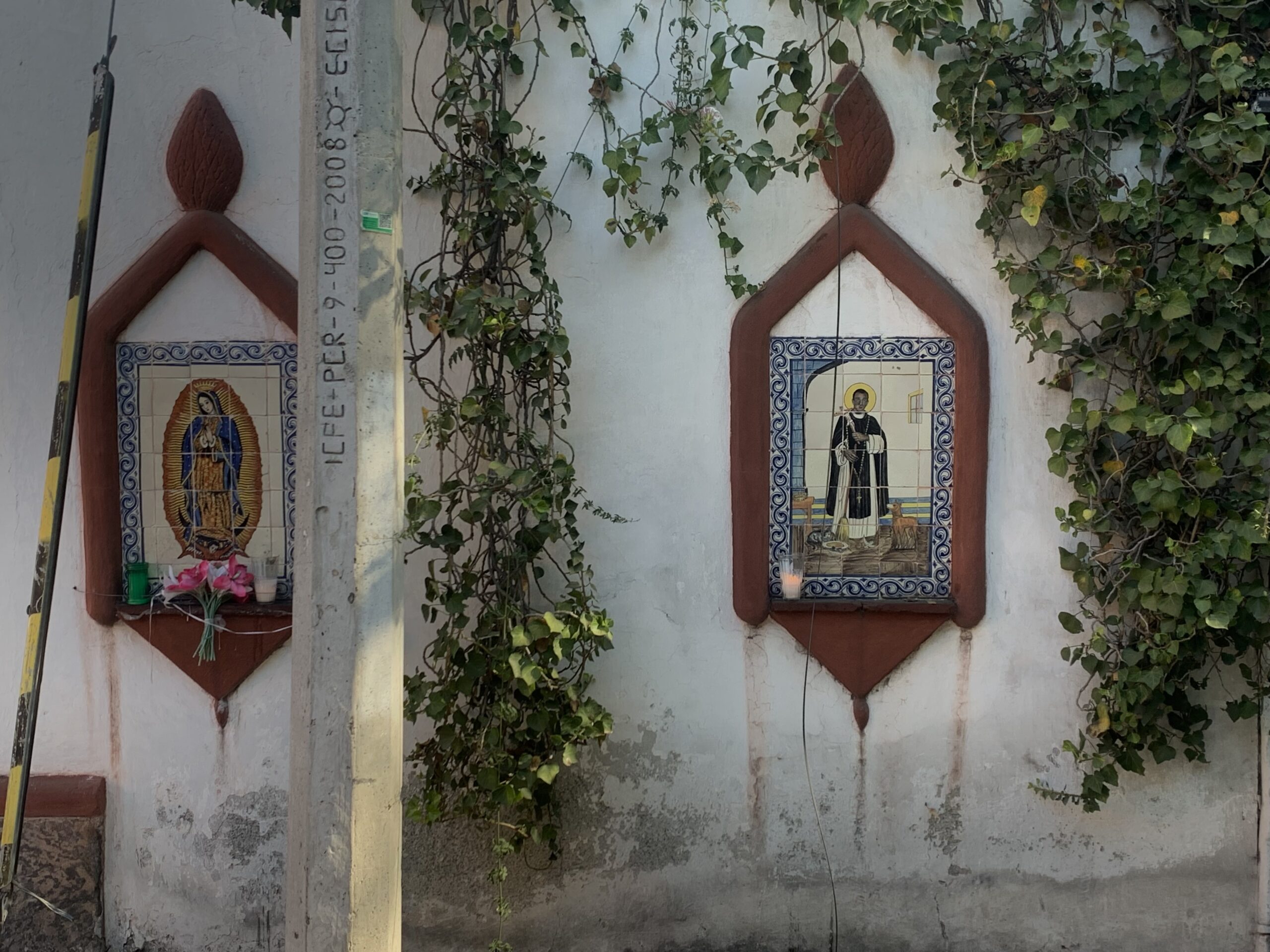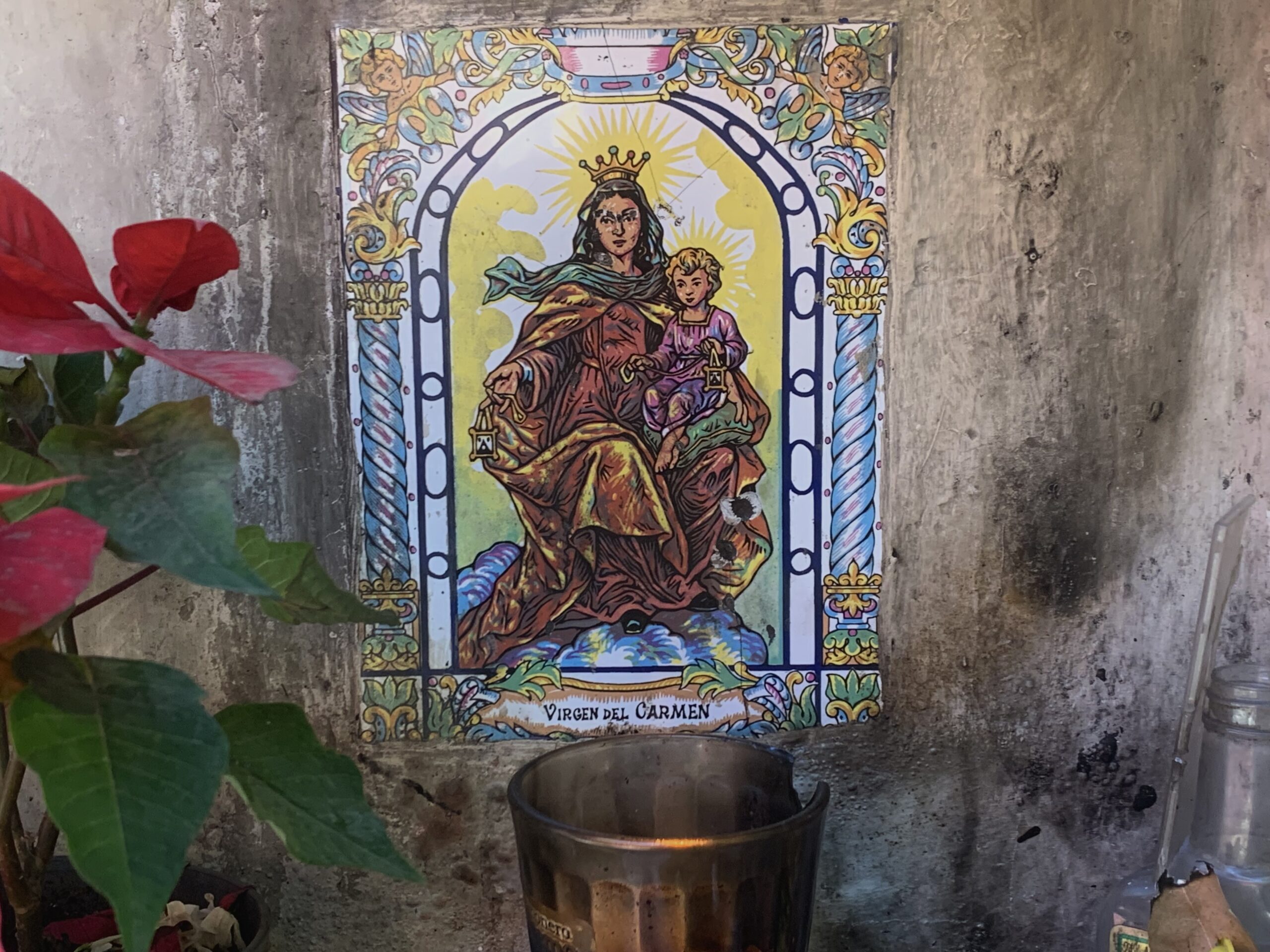 Y vas a encontrar algo más, aunque por su discreción la tienes que detectar con vista de detective: en una pared, sobre un vértice de la calle que se tuerce, existe una oquedad. Ahí dentro está la Virgen del Carmen pintada con esmero sobre una baldosa blanca con la custodia de dos angelitos. Abajo, una veladora negruzca la ilumina con luz naranja; a su derecha una nochebuena y abajo, a sus pies, lo insólito: varios dulces. Hay pastillas Tic Tac de menta, paletas, chiclosos Aciduladitos. ¿Por qué? No es que la patrona de los marineros sea una golosa sin remedio. No.
