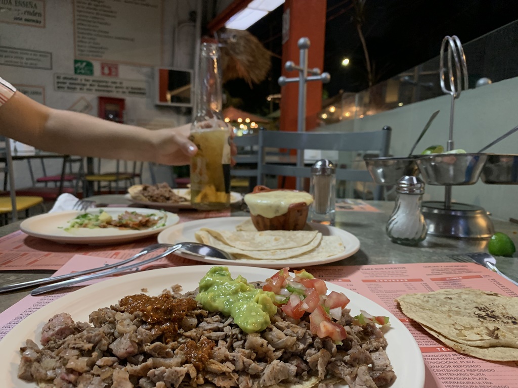 No queremos demeritar a sus hermanos menores costilla, chuleta o pastor (cortado aquí en finísimas láminas, como debe ser, con su intenso adobo de achiote, especias y chiles rojos), pero Juan Bisteces ha reinventado el bistec. Quisiera tener a Lalo cerca, llevarlo en la noche a Avenida Universidad y meterlo en el local donde todo-todo-todo es naranja (su fachada luminosa, sus sillas, la vestimenta de los meseros) por una sencilla razón: al ver ese color aumentan tu ritmo respiratorio y presión arterial, y por lo tanto te da hambre. Ella aquí se calma con tacos de bistec solo, bistec con nopal, bistec con hongo, bistec con queso y más combinaciones. Ignoro la razón científica con la que la teoría de Lalo se refuta, pero en esta taquería el bistec es jugoso, consistente, suave y de sazón penetrante, como si se condensaran las virtudes de la carne, y por si algo le faltaba puedes agregarle la sustancia apoyada en tu mesa de melamina de ponderosa, manjar a medio camino entre la salsa verde y el guacamole (perdón, Lalo, ustedes tienen a Messi pero la salsa ‘guacamolizada’ de Juan Bisteces es muy superior al chimichurri). Exprime a tus tacos unos limoncitos, pizcas de sal y listo. ¡Ñam!