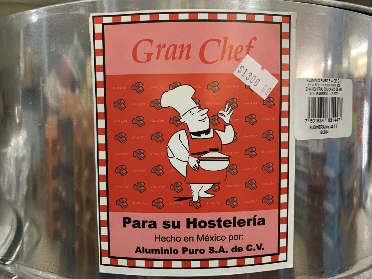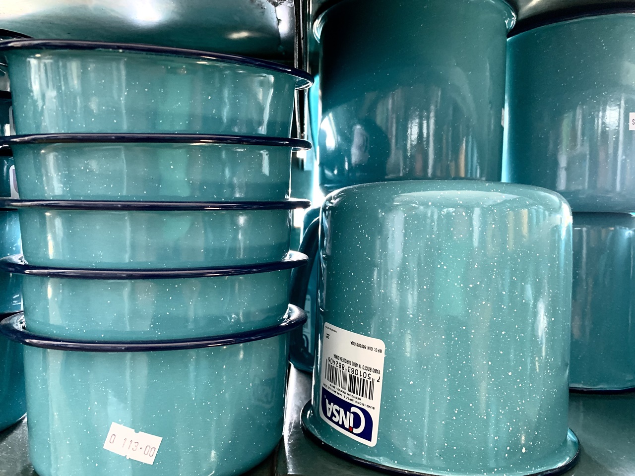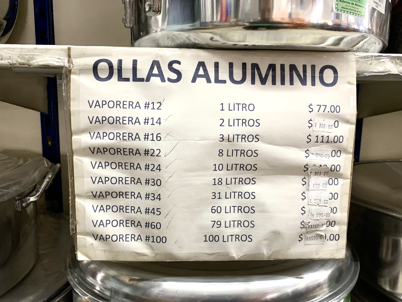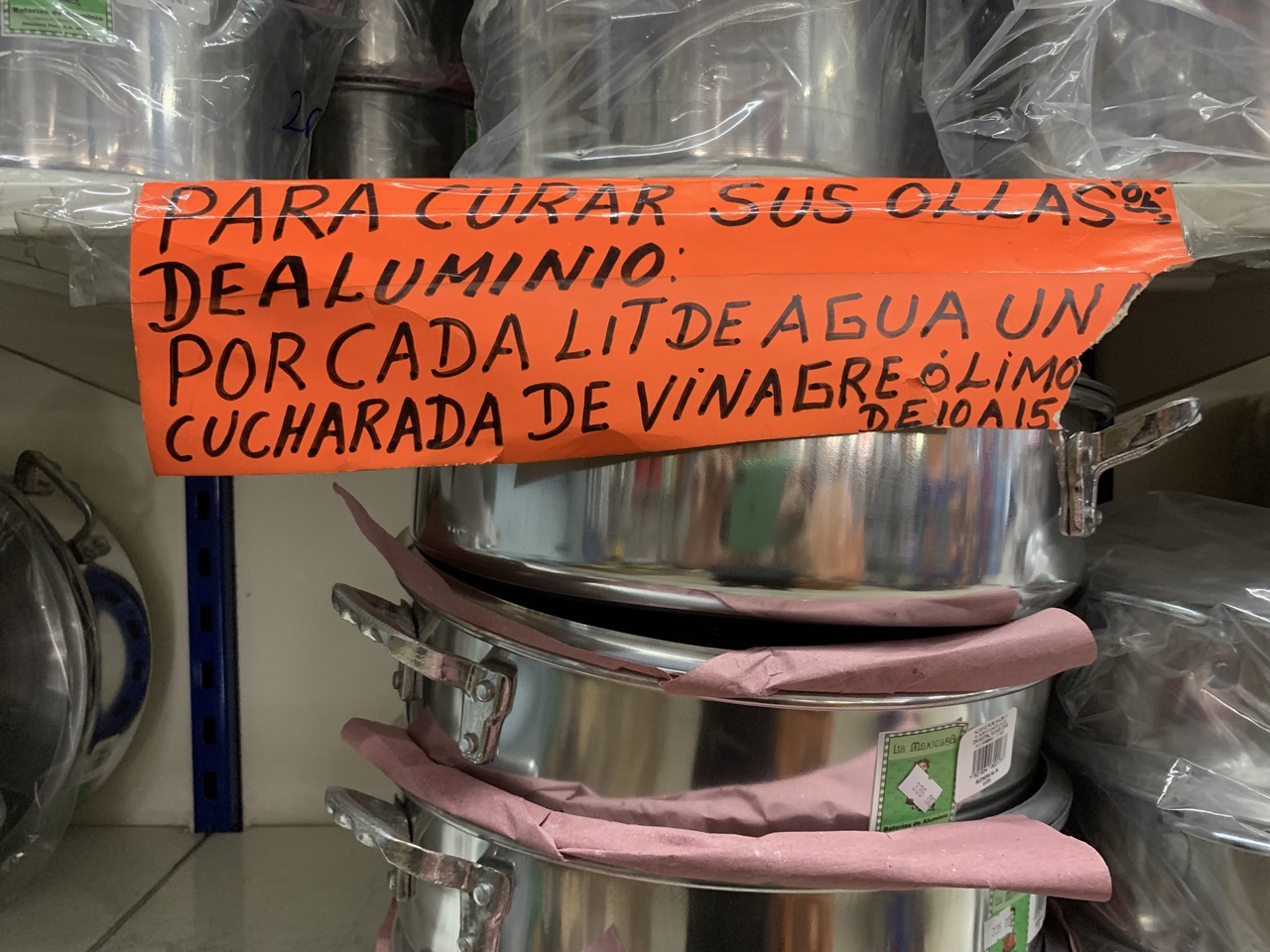 Por eso está lleno de cosas raras. Por decir algo: bajo las vaporeras de 1 a 100 litros, pegado con Diurex a un anaquel, un cartel naranja fluorescente, mal recortado, rotoso, te dice: “Para curar sus ollas ¡ojo! de aluminio por cada lit de agua un cucharada de vinagre o limo de 10 a 15”. ¿Entendiste algo? Yo tampoco.