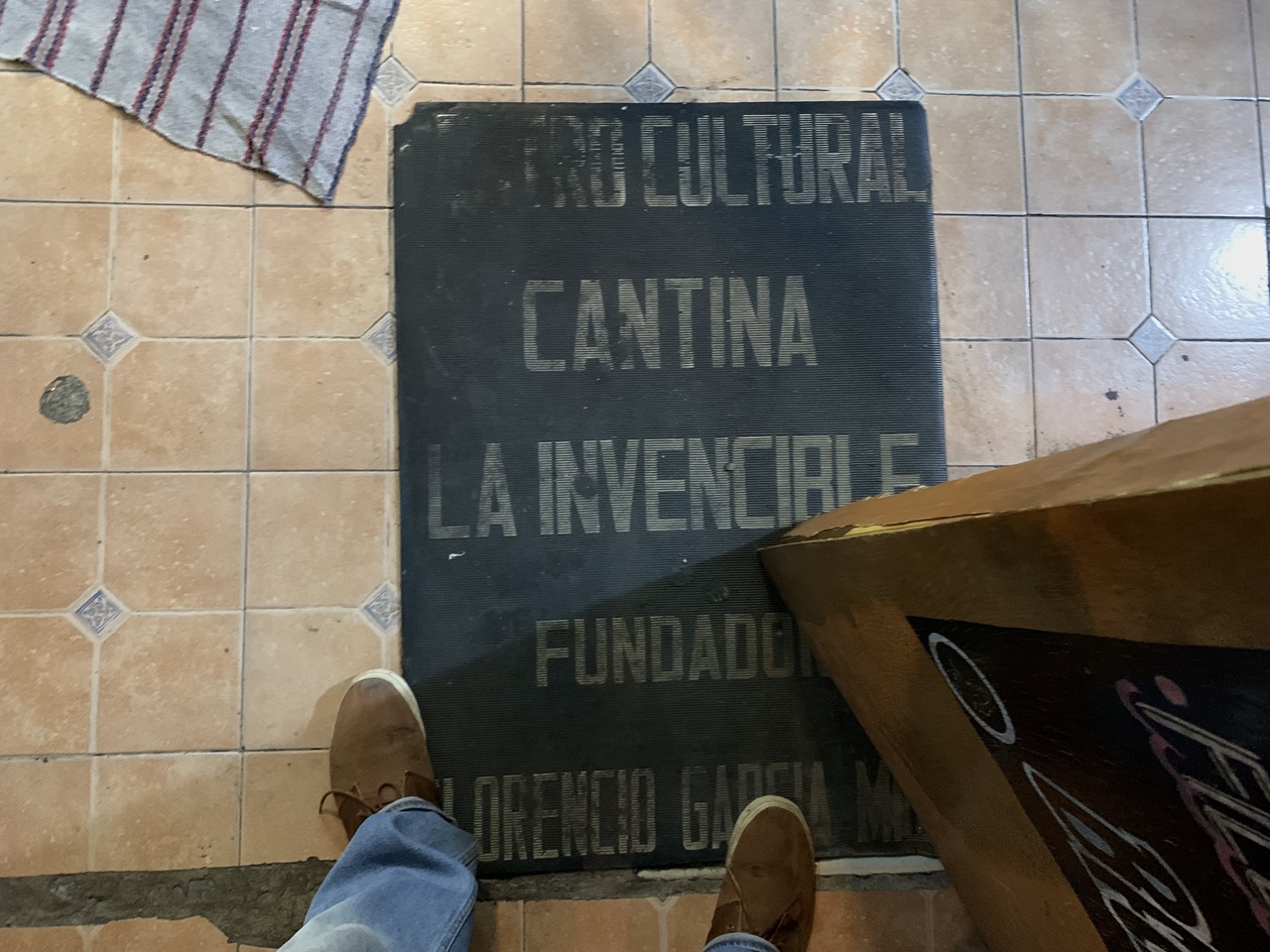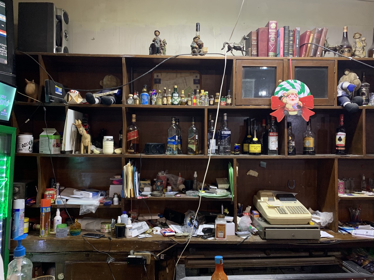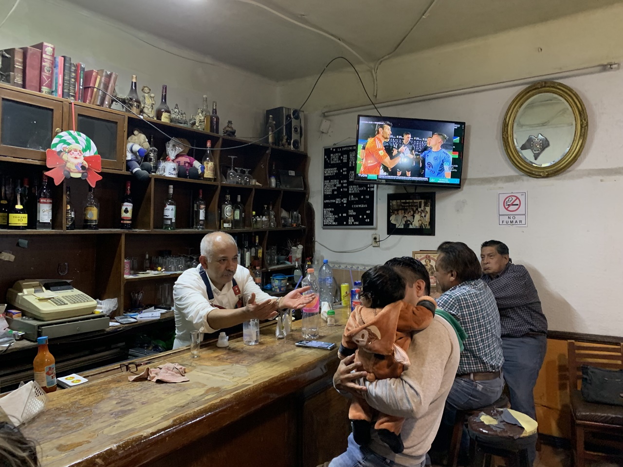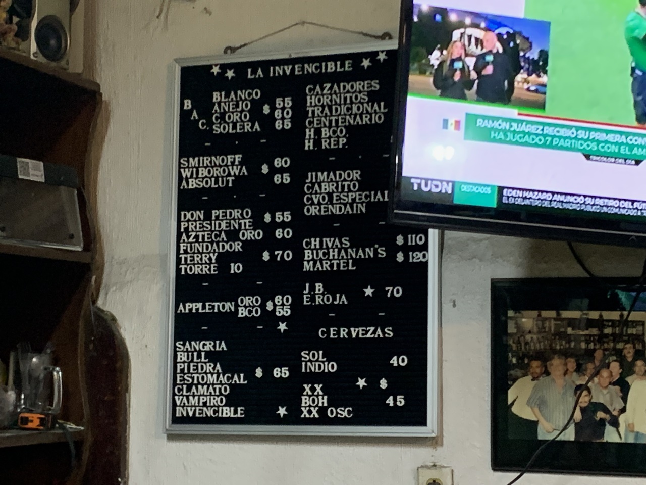 Concluyo la lección de historia. En seguida voy hacia la barra del bar y observo el aparador detrás, que también es un desmadre. Entre enredaderas de cables grasosos, el mueble carga cosas desde que a La Invencible la fundó en 1930 un empresario llamado Florencio García. Al catálogo de bártulos lo cubren capas de polvo de los días de Sarita Montiel, Ávila Camacho, Angélica María, Cabinho. De todas las épocas. Ahí les van solo algunos de los 3417 objetos que ahí reposan: un Santa Clos de cartón, una máquina registradora, un puma de la UNAM de peluche, muñequitos de pasta, una Valentina para mariscos, un bote de Resistol y otro de canela, una engrapadora, bocinas viejas, latas de atún, una baraja española con el Dos de Oros a la vista. Y hasta arriba de la estantería, inalcanzables sin una escalera, varios libros: “Historia verdadera de la conquista de la Nueva España”, “Cantolla, el aeronauta”, “Fundamentos de la filosofía marxista”.