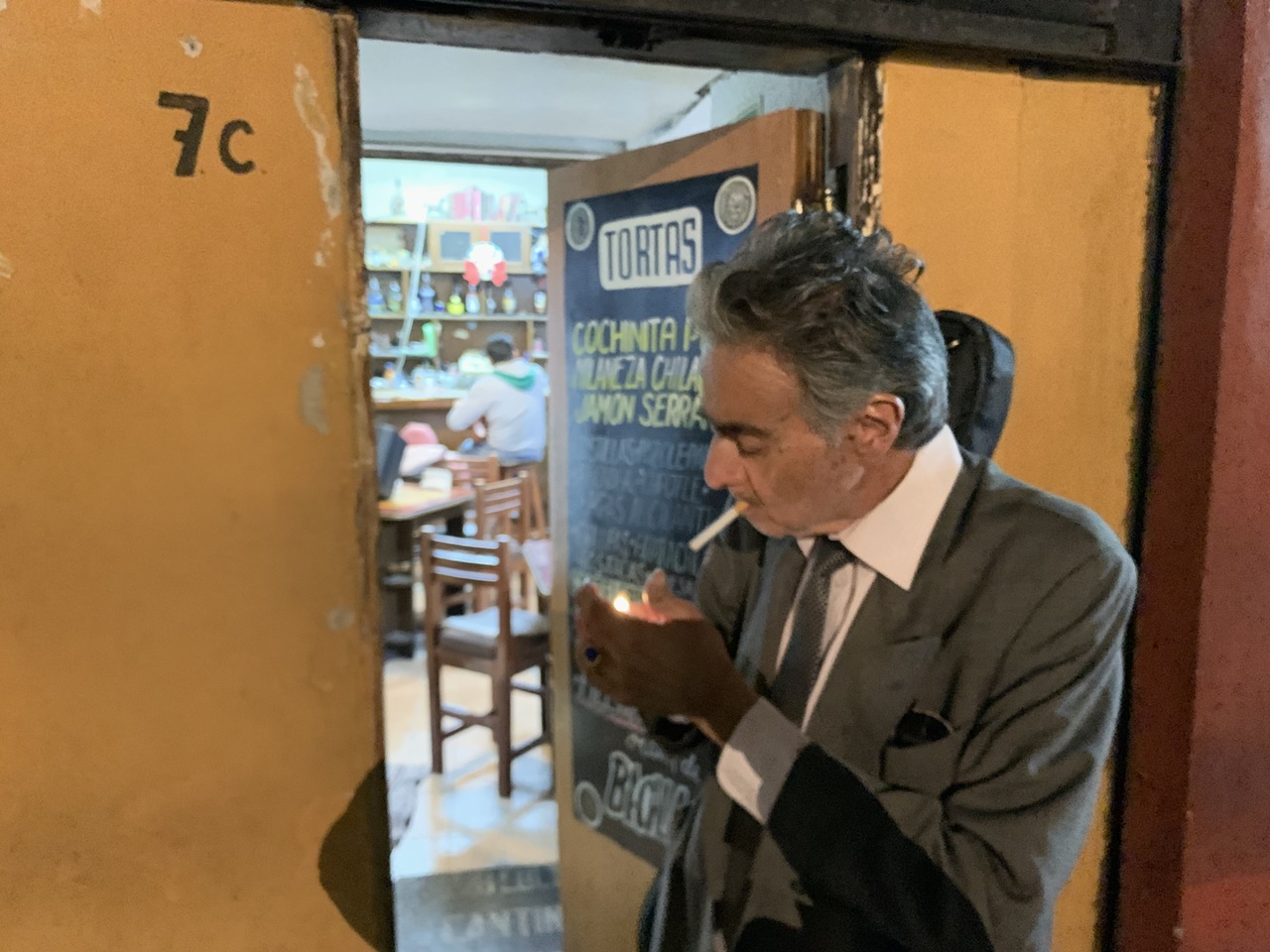 De pronto, a lo lejos y sobre una fachada vieja, leo “Fonda”. ¿Será aquí el mítico lugar que busco? Bajo el marco de una puerta abierta que descarga al empedrado de San Ángel mucha luz y temas rancheros para viejos melancólicos, un desgarbado señor setentón de traje gris, corbata negra y guitarra a la espalda husmea hacia el interior. Hago lo mismo, quedamos hombro a hombro. “¿Qué busca?”, me pregunta viéndome con ojos agotados. “A La Invencible”, respondo. “¡Es aquí!”, aclara. Al entrar veo sorprendido que en plena cantina hay una carriola. Aún no me siento y un señor de impecable camisa blanca, pelo blanco y lentes me intercepta; sin demasiada cortesía me pregunta qué beberé. Tiene pinta de médico enfadado, no de cantinero. “Una Bohemia”, le pido. Ahora sí me dispongo a sentarme, pero atrás mío alguien me interrumpe. Volteo: es el guitarrista de traje: “¿Podemos compartir?”, me propone señalando una mesa. Noto que a nuestro alrededor las mesas de este salón miniatura, seis en total, están vacías. No importa, lo que menos quiero esta noche de martes es dialogar conmigo mismo: tengo muy poco que contarme. “Claro, siéntese”, le ofrezco. Saca una anforita y bebe: “es whiskey”, dice. “¿No quiere mejor una cervecita?”, lo invito y acepta. Solicito al médico-cantinero otra Bohemia. El guitarrista brinda chocando su botella con la mía, damos unos tragos y coloco entre ambos un aparato electrónico.