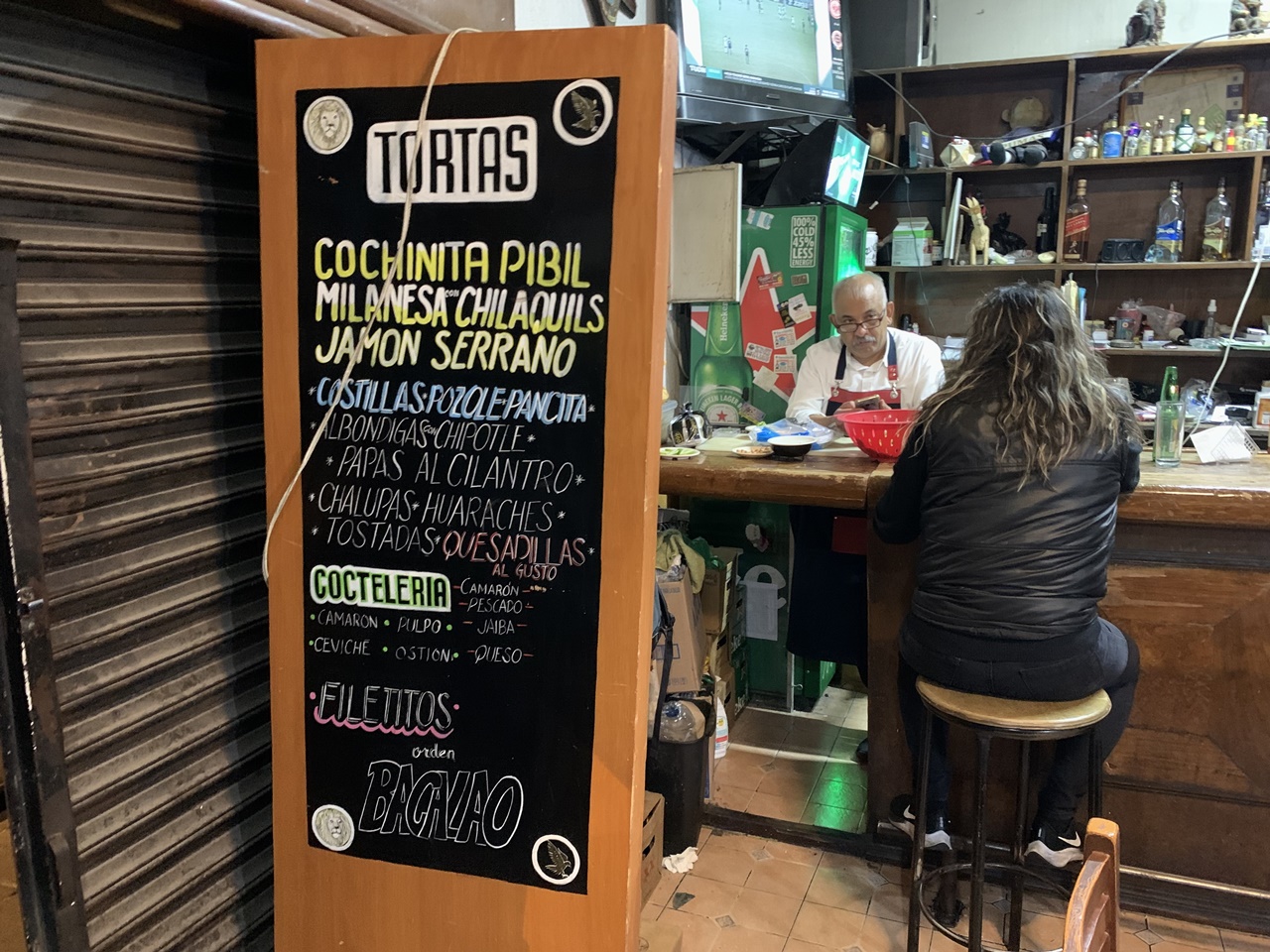 Carlos se refresca con su Bohemia, mira nostálgico a ningún lado y luego a mí. Lo extraña que yo indague las paredes forradas de madera con anuncios de los platillos que salen de la cocina: torta de milanesa y chilaquiles, albóndigas con chipotle, papas al cilantro.