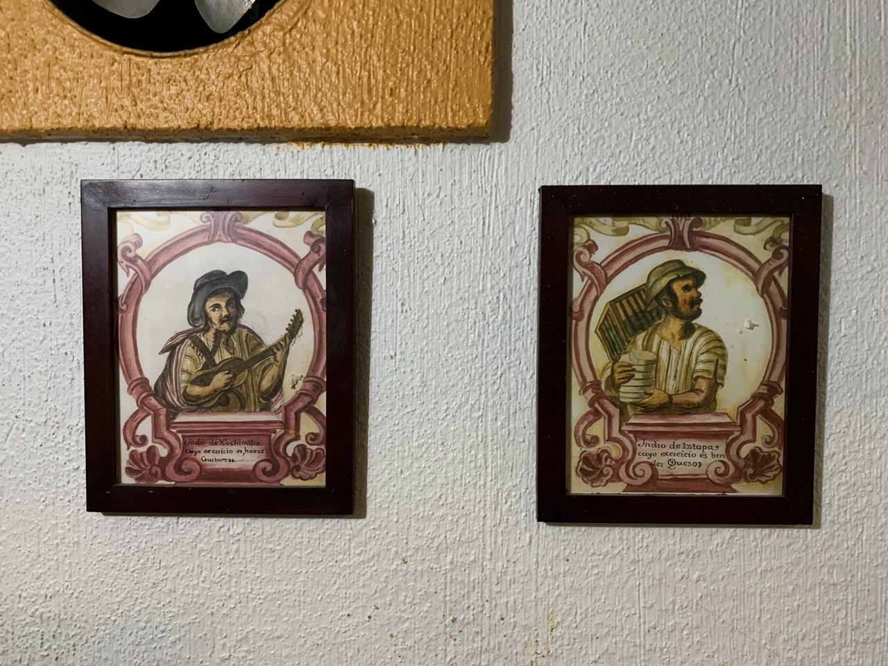 A la altura de nuestras cabezas, en fila e iluminados por farolitos de pueblo, montones de cuadros de épocas arcaicas cuelgan con ilustraciones de antiguos mexicanos y sus descripciones. Me pongo de pie y leo las líneas escritas con ortografía antigua: “Indio de Xochimilco, cuyo exercicio es hazer guitarras”. “Indio guasteco, cuyo exercicio es cojer y vender pericos”. “Indio de Xochimilco, cuyo exercicio es hacer canastas y chichihuites”. “India de Tlaxquaque, cuyo exercicio es vender nenepiles, esto es, lengua cocida”.
