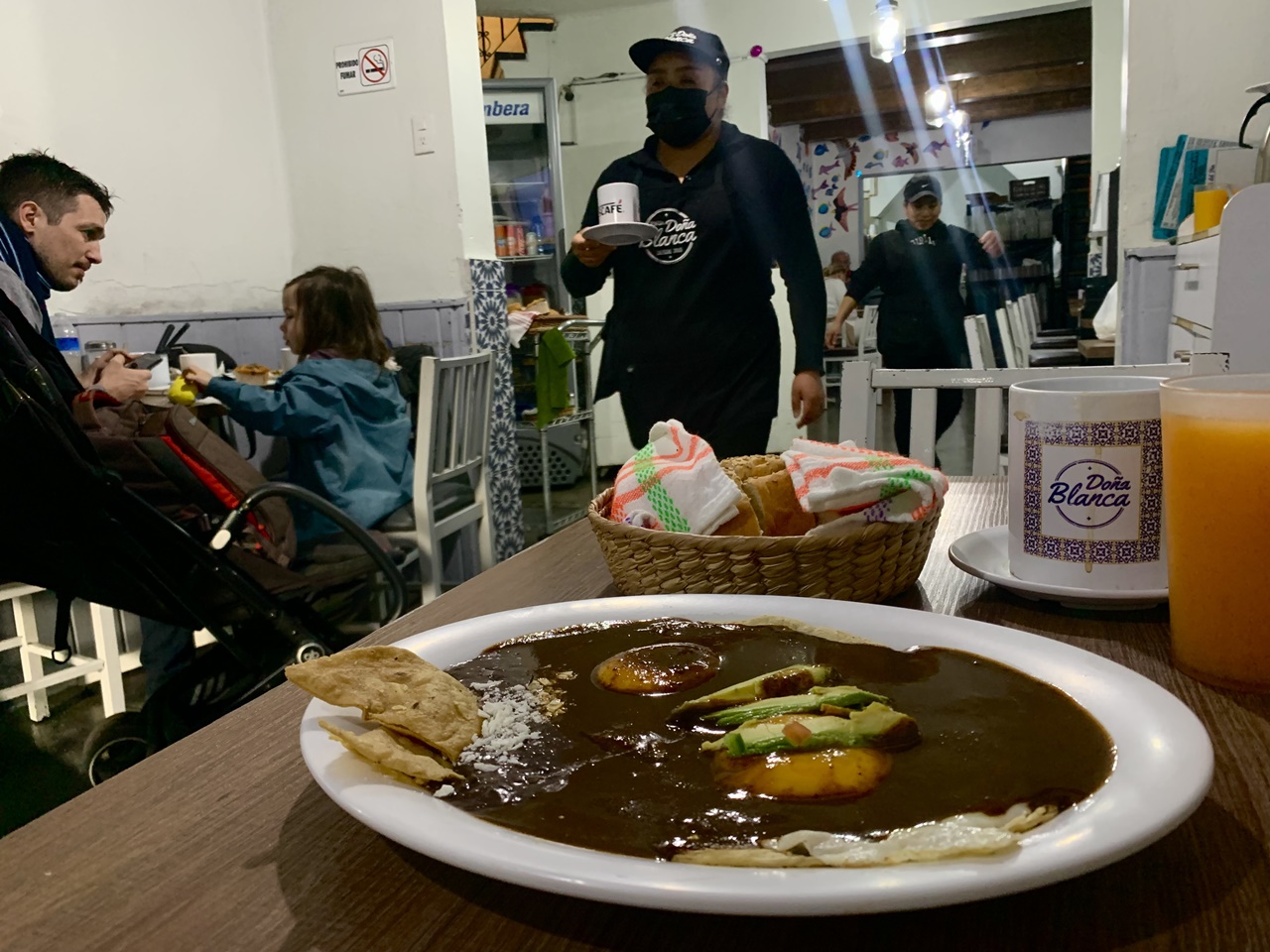 Desde que en 2010 nació, Doña Blanca reúne solitarios: clientas y clientes a los que quizá la vida les está jugando una mala pasada pero que confían en que pronto soplarán tiempos mejores. La razón de que vengan a desayunar es que este lugar es un mesón, un refugio con solo lo indispensable. A los helados muros de ladrillo si acaso les dieron una manita de pintura blanca, y a uno de ellos lo colorearon con pececitos de colores para alegrar un poco el ambiente sobrio (el único adorno son unas bicis miniatura en alambre que nadie observa). Los techos los sostienen vigas de madera de un siglo de vida, de cuando esta zona de la capital presumía mansiones art noveau que habitaban don Venustiano Carranza y otras celebridades.