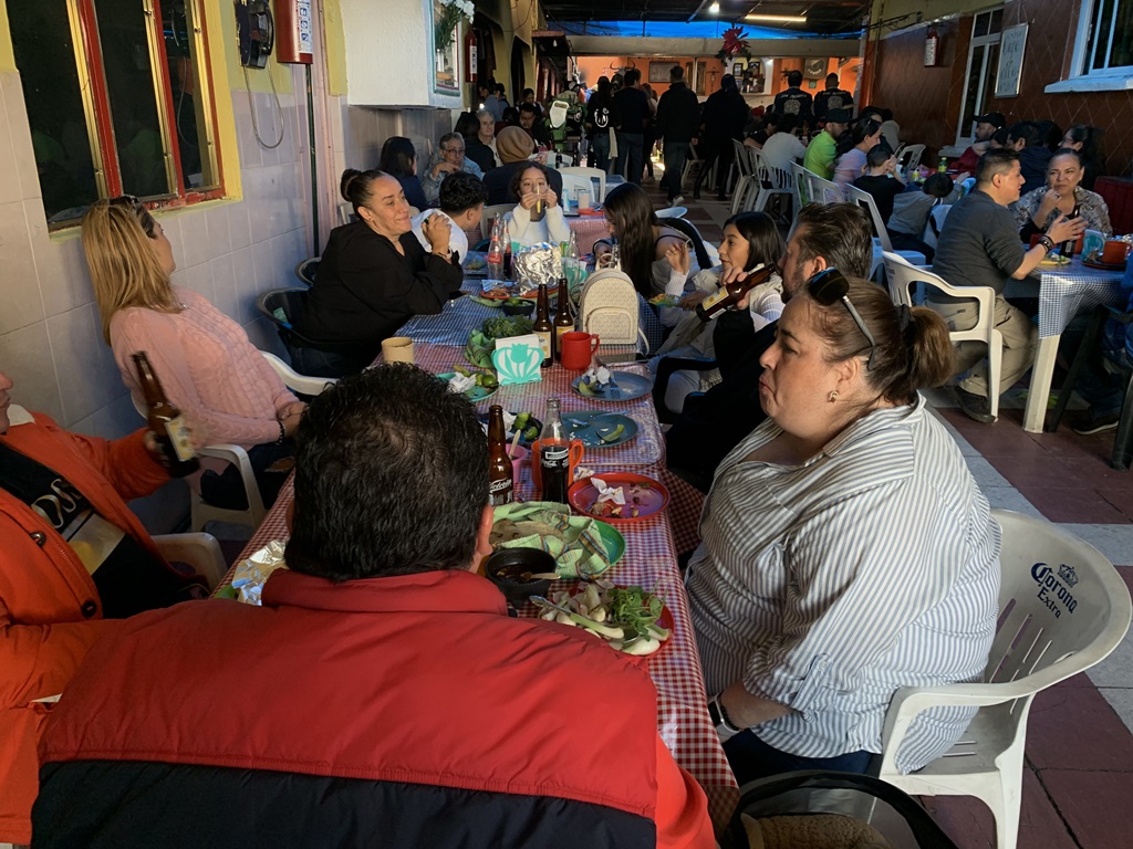 De pronto, una mesera toca la espalda al joven que de pie espera delante mío: “¿Qué se toma?”. “Clamato con chamoy, piquín y ajónjolo (así dijo)”. “¿Y sus acompañantes?”. A los gritos porque la música no da tregua, desde la fila para la barbacha el joven pregunta a sus tres amigos: “¿Qué se tomaaan?”. Contestan a todo pulmón que una Victoria. “¿Le pago las bebidas?”, pregunta a la mesera. “No, al rato”, contesta ella y se va.