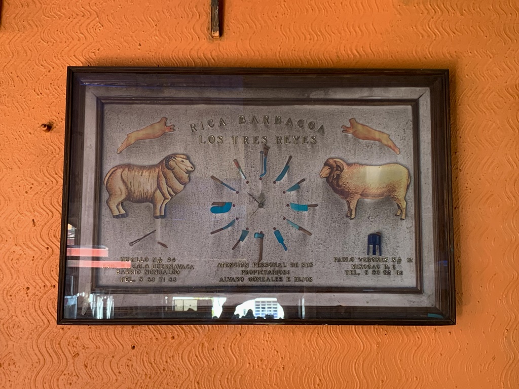 A tu mesa llegas caminando entre unos muros donde pende un reloj cuyos numerales son los 12 cuchillos con que se mata al borrego (qué cruel) y una ofrenda con la Morenita y veladoras dedicada a los difuntos vaqueros que en 1982 fundaron Los Tres Reyes.