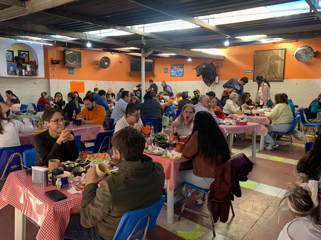 En el momento en que en este salón -al que los fines de semana acude medio México- se libere una mesa y te digan “pásele”, tu familia se sentará pero tú volverás a pararte. Ni modo. Ahora hay que hacer una nueva fila para pedir pierna, lomo, cuello, espaldilla, costilla, falda, o la parte del borrego que quieras. Aguardar tu turno en una segunda cola sería insoportable si no te deleitaras con un espectáculo del que eres parte. Entre las mesas atestadas, los niños juegan en el piso con su kit City Police que su mamá les compró en el puesto de juguetes del restaurante y que incluye patrulla, helicóptero y moto policiales (a eso juegan nuestros niños, no olvides que son chilangos). A la izquierda puedes husmear a las mujeres que hacen tortillas a mano, y los seis hornos donde se cuecen los pobres borregos que embestirán tus colmillos. El Grupo Arrieros invita a la gente a pedir una cancioncita. Gritan porque el ruideral de las mesas felices es diabólico.