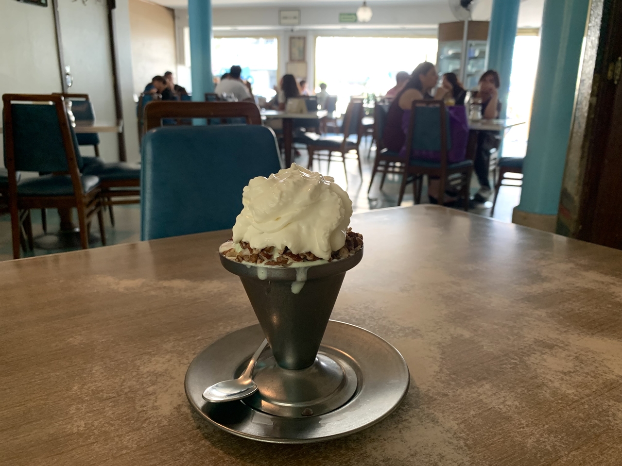 ¿Y ya? ¿No revelará nada más? El señor se apiada y me da otro dato histórico: “Pietro inventó el popular Souvenir Chiandoni”. Si en la carta lees sus ingredientes sabrás que era un postre riesgoso: pastel con base de pan envinado, helado de mamey, vainilla y cubierta de avellanas molidas. Fascinó.