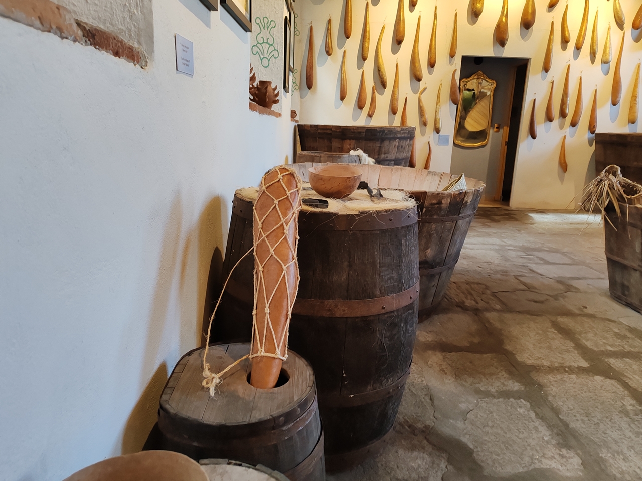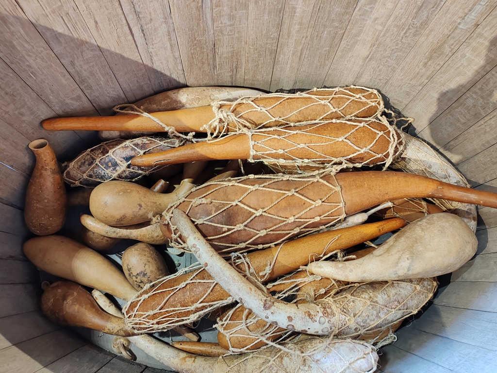 Los acocotes comparten espacio con las jarras pulqueras de vidrio y barro, con replicas del maguey y el tlachiquero (ese hombre que acompañado de su burro y el raspador, libera el agua miel) y con fotografías, obras de arte y antiguas representación del cactus.