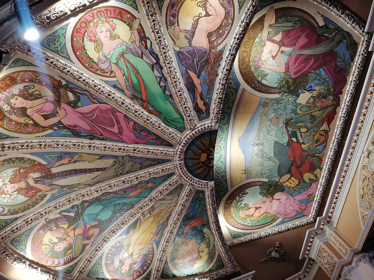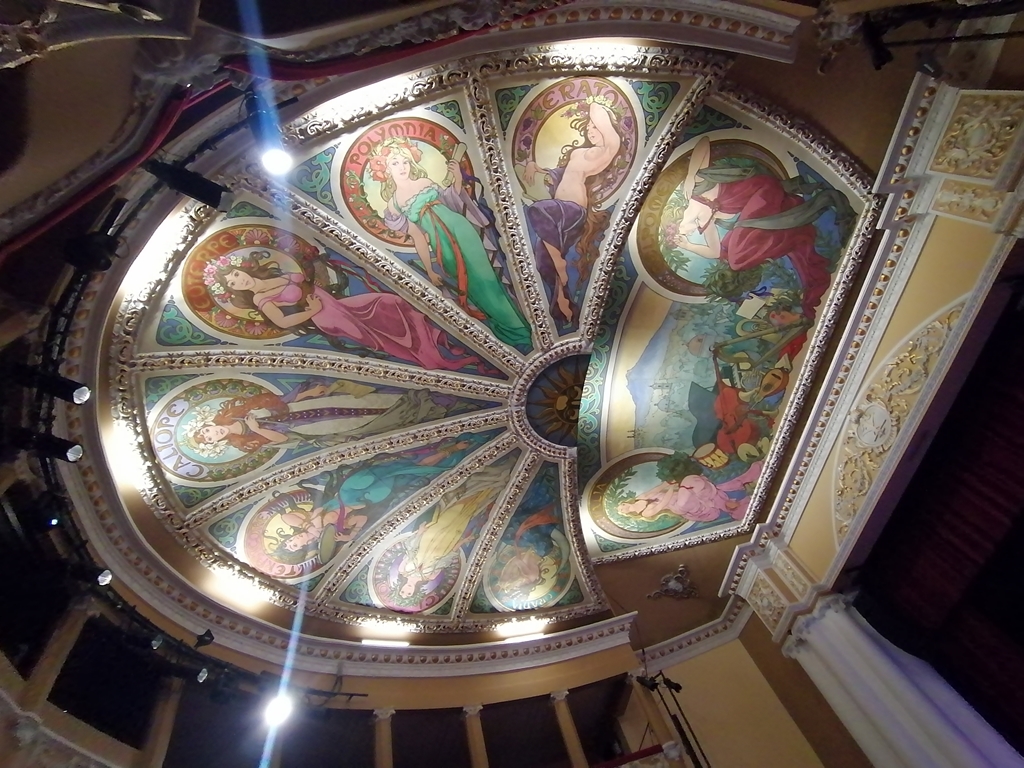 Al ingresar al vestíbulo, el visitante se encuentra con un espacio elegante, decorado con molduras doradas, candiles de cristal y muros en tonos durazno, que evocan una atmósfera de opulencia. Pero sin duda, el detalle que más sobresale del interior es el plafón pintado en estilo art nouveau. Allí, las nueve musas de las artes griegas sonríen pícaras bajo la vigilancia de la Malinche. Estas musas, guardianas del teatro, fueron obra del artista francés John Fulton, quien dejó su impronta en esta joya arquitectónica.