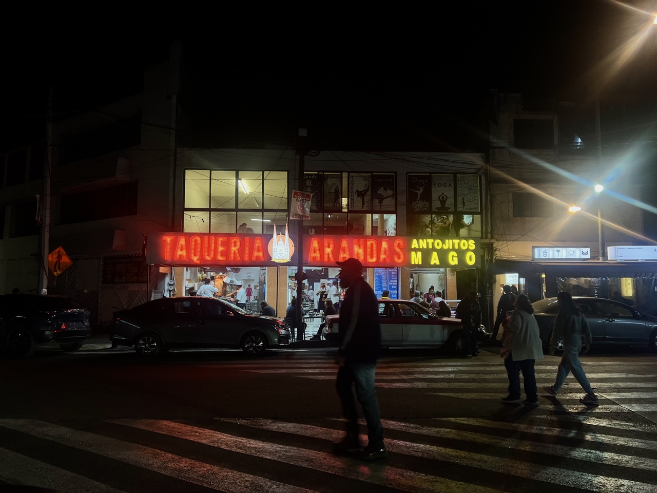 Tarde y hasta la noche, bajo la luz neón anaranjada de Taquería Aranda se mueven veloces meseras y meseros, blancos desde el mandil hasta la cofia, como un ejército de enfermeros que te regalan salud desde el momento en que dicen “¿3 para que sean 6?, ¿4 para que sean 8?”. Los solitarios, las familias, los niños, los abuelos, los enamorados, dicen “ajá” casi sonriendo, o de plano sonriendo.