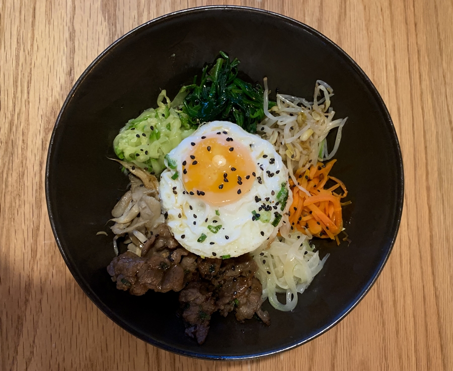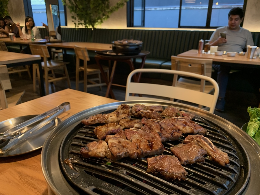 Y ahora, brevemente expliquemos lo que llegó a nuestra mesa, vecina de un árbol alumbrado en la noche con filamentos luminosos. Uno, bibimbap: una cama de arroz donde reposan verduras salteadas, carne de res en tiras, pasta de chile fermentado. El baño de aceite y semillas de sésamo catapultan los sabores. Dos, haemul pajeon: una tortilla de mariscos y cebollín con harinas de arroz y trigo, fritas hasta quedar crujientes. Tres, LA galbi: costillas de res en delgado corte transversal que sacas de un mini asador. Y prepárate: la carne coreana, muy distinta a la nuestra, es dulzona por el marinado en jarabes de maíz, arroz y pera asiática. Todo es un viaje suculento.