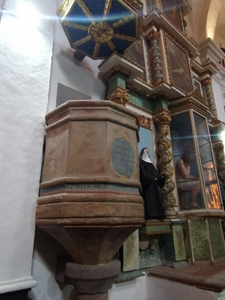 La pila bautismal, de tamaño superior al común, sugieren algunos estudiosos e historiadores, responde a la necesidad de bautizar a adultos conversos, posiblemente en ceremonias colectivas.