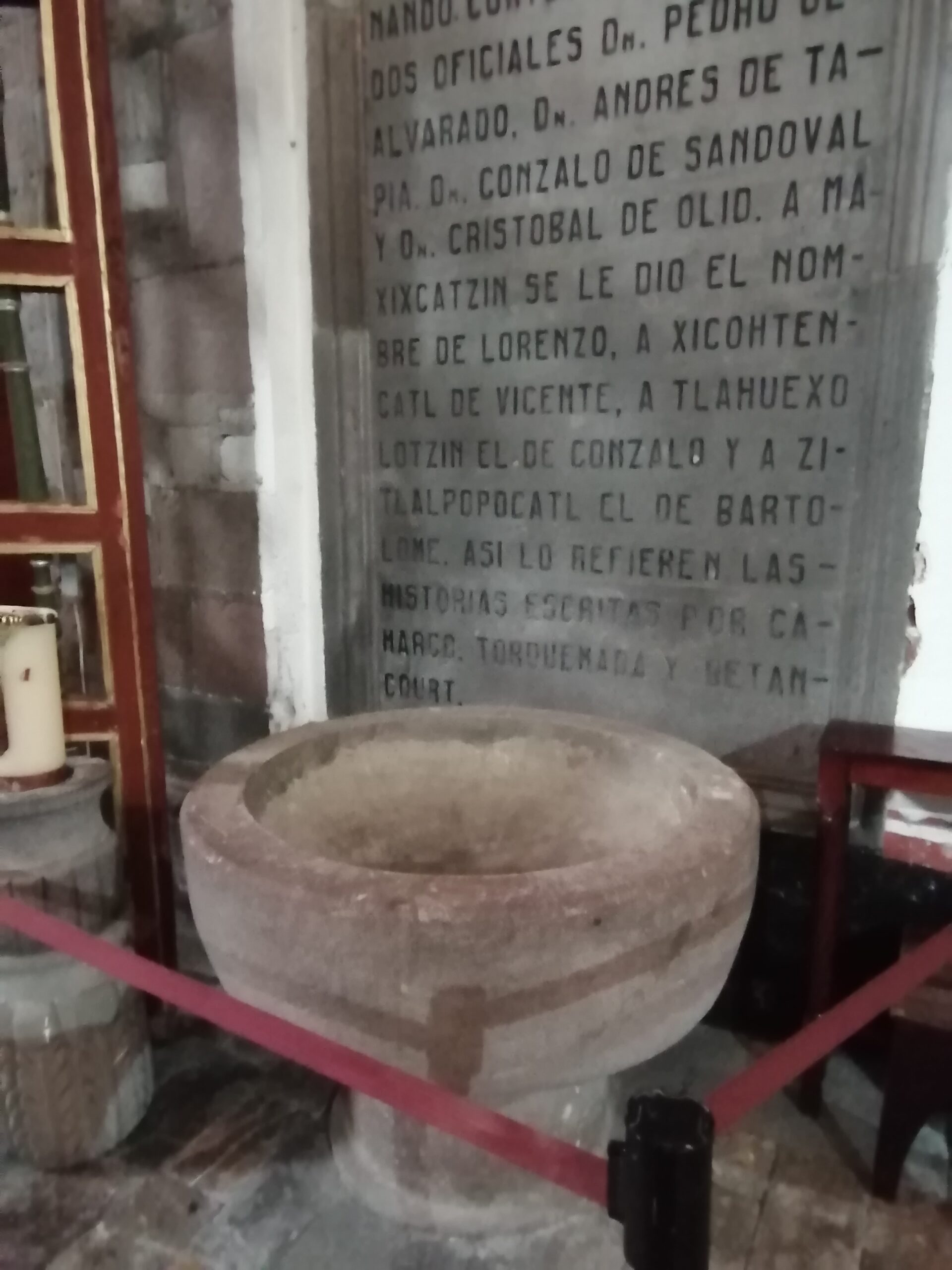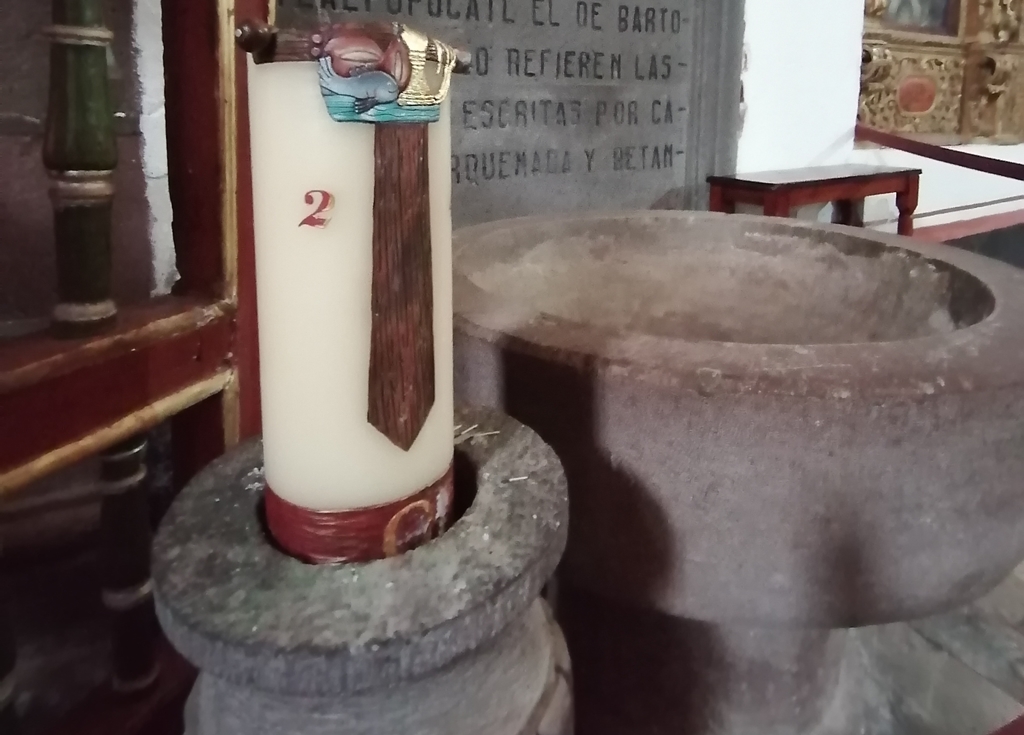 Tlaxcala, Tlax.- La profunda relación entre Tlaxcala y España, próxima a cumplir 500 años de historia, se consolidó con el bautizo de los cuatro señores del altépetl tlaxcalteca en la antigua pila bautismal, una imponente pieza de cantera labrada.