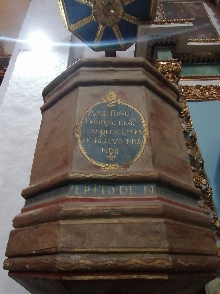 A pocos metros, una inscripción refuerza la importancia del lugar con la frase: “Aquí tuvo principio el Santo Evangelio en este Nuevo Mundo”.